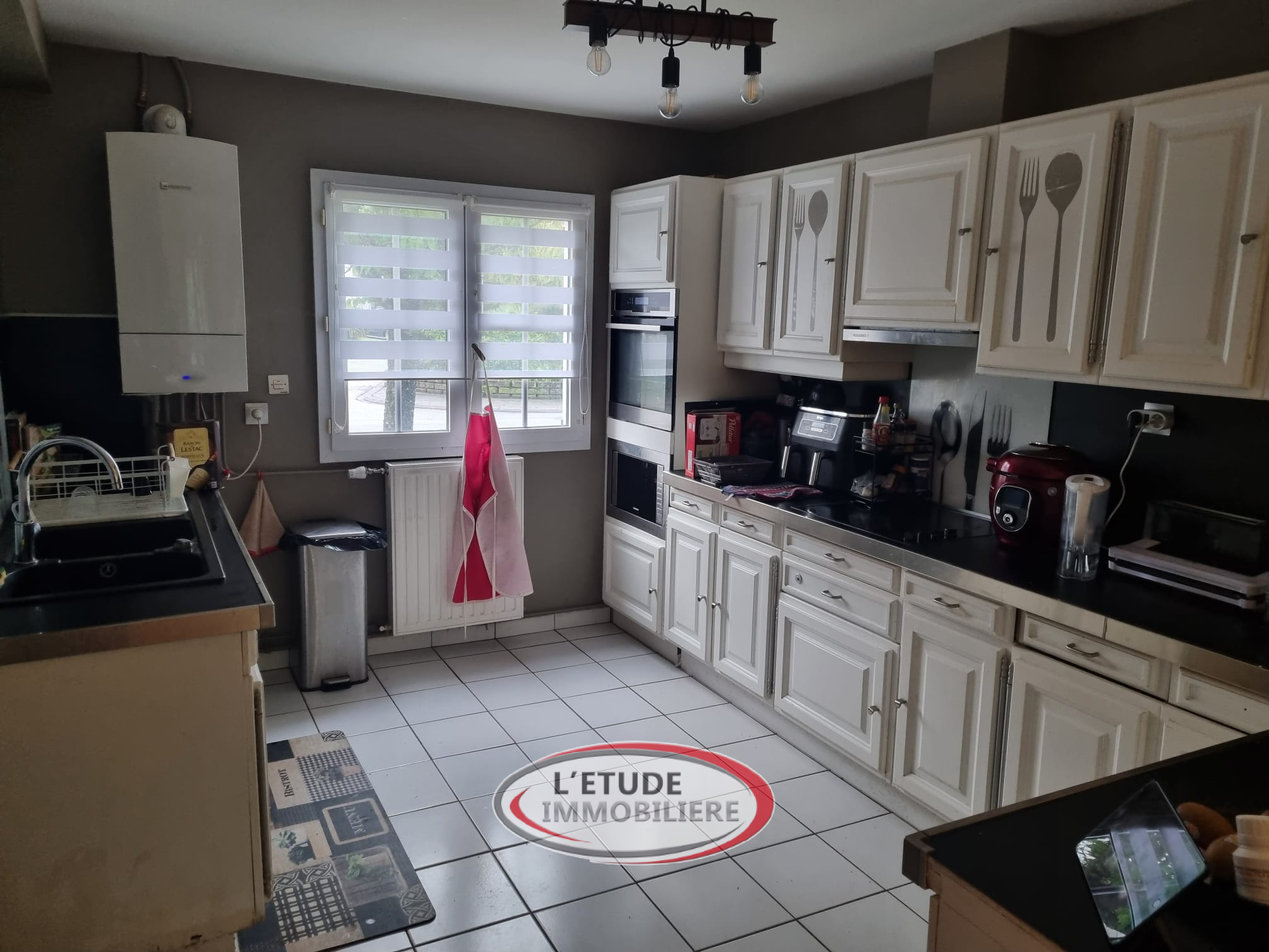 A l'étage : trois chambres, salle de bains avec baignoire et douche, toilettes séparées. Garage.
