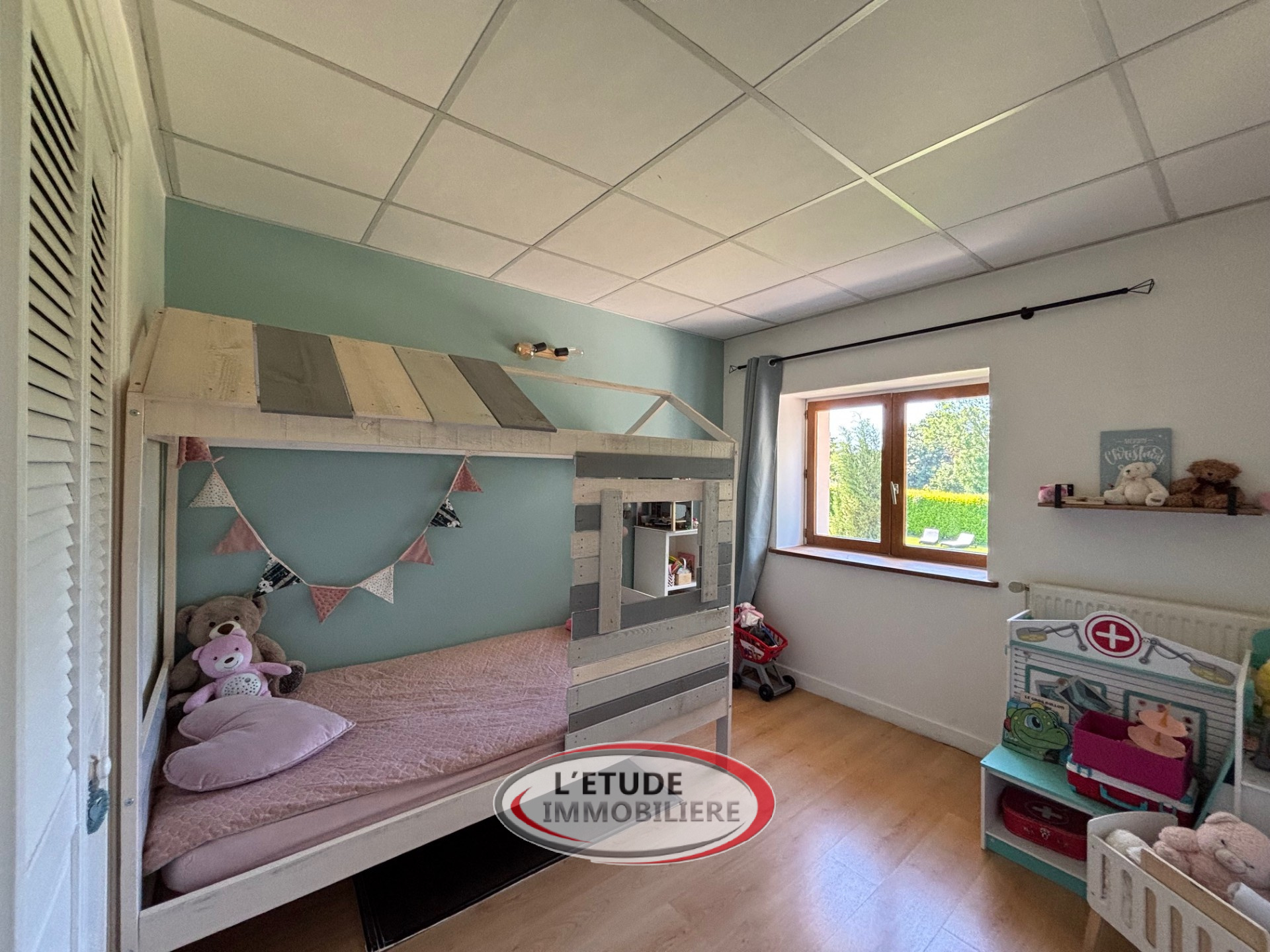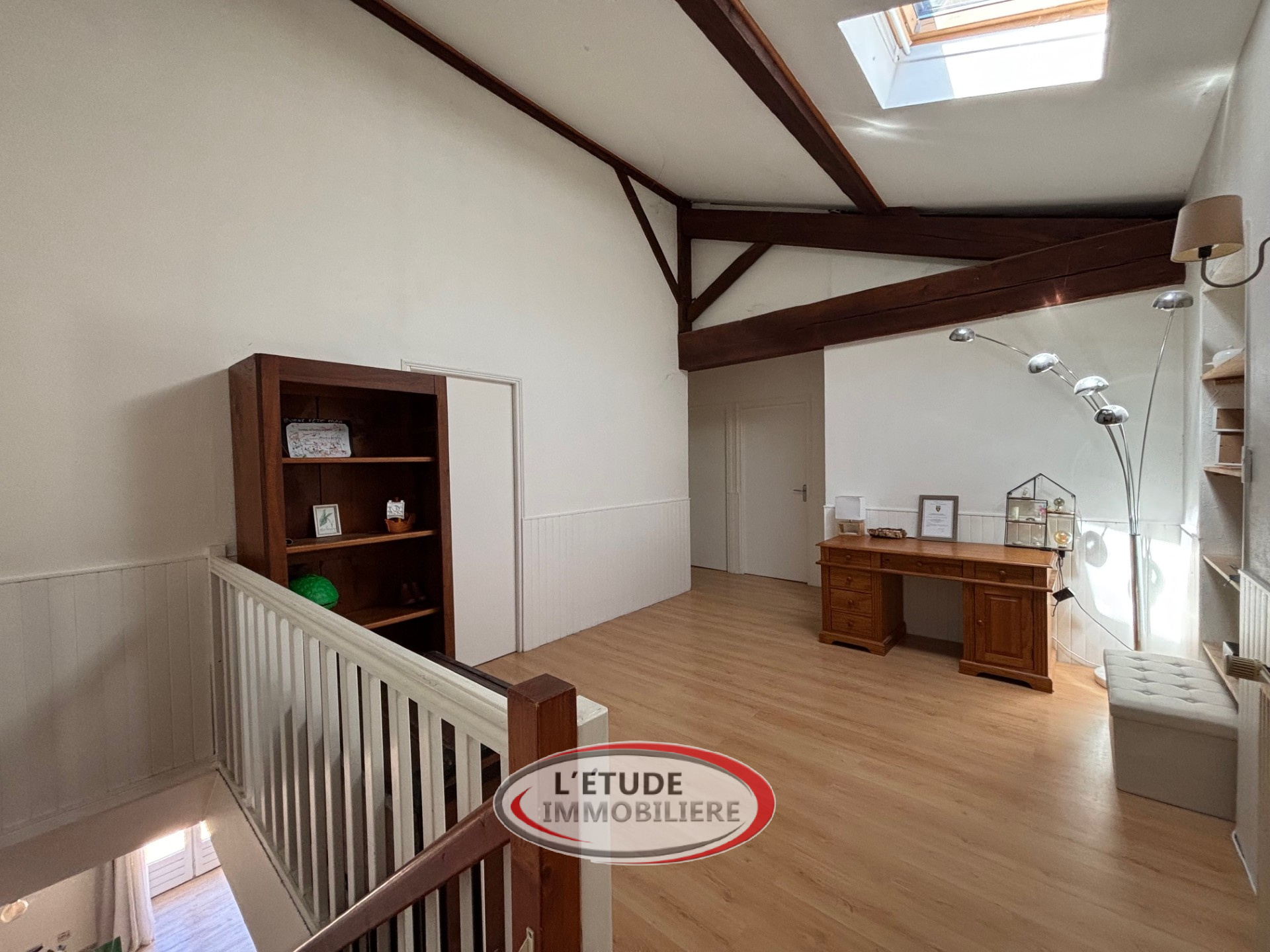 A l'étage, Vous trouverez un plafond cathédrale lumineux, un dégagement/bureau, trois chambres, salle de bains et WC.