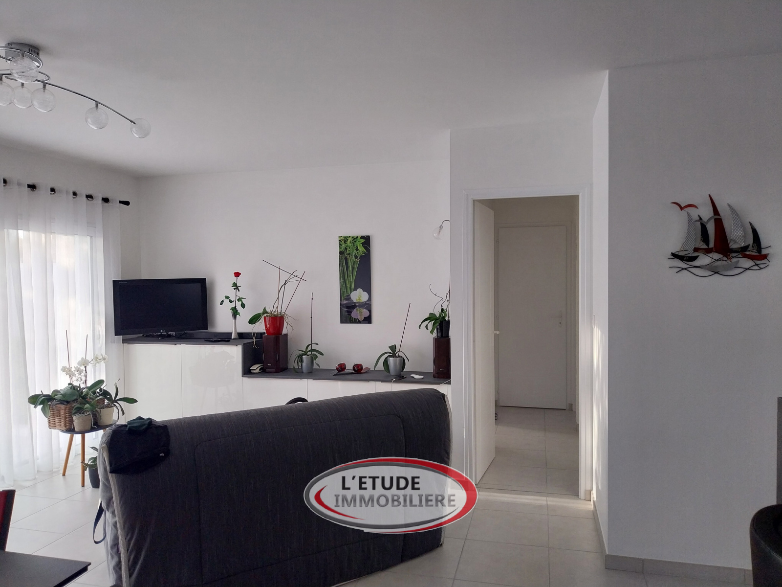 Elle propose 72 m² habitables entièrement en plain pied, organisés de la façon suivante : une entrée avec placards, une pièce de vie (avec 2 baies donnant sur une terrasse sud-ouest) de 35 m² ouverte sur une cuisine aménagée et équipée, un dégagement desservant deux chambres avec placards, une salle d'eau et un WC séparé.